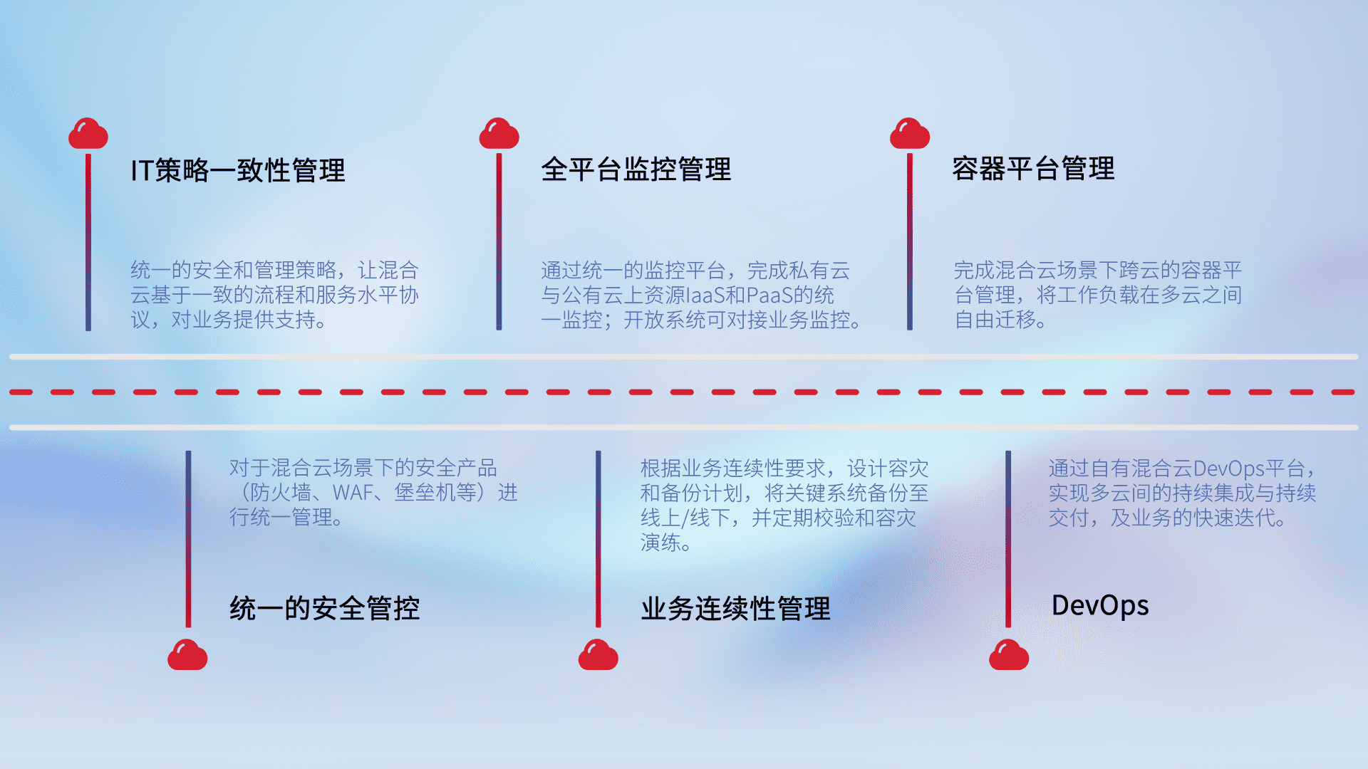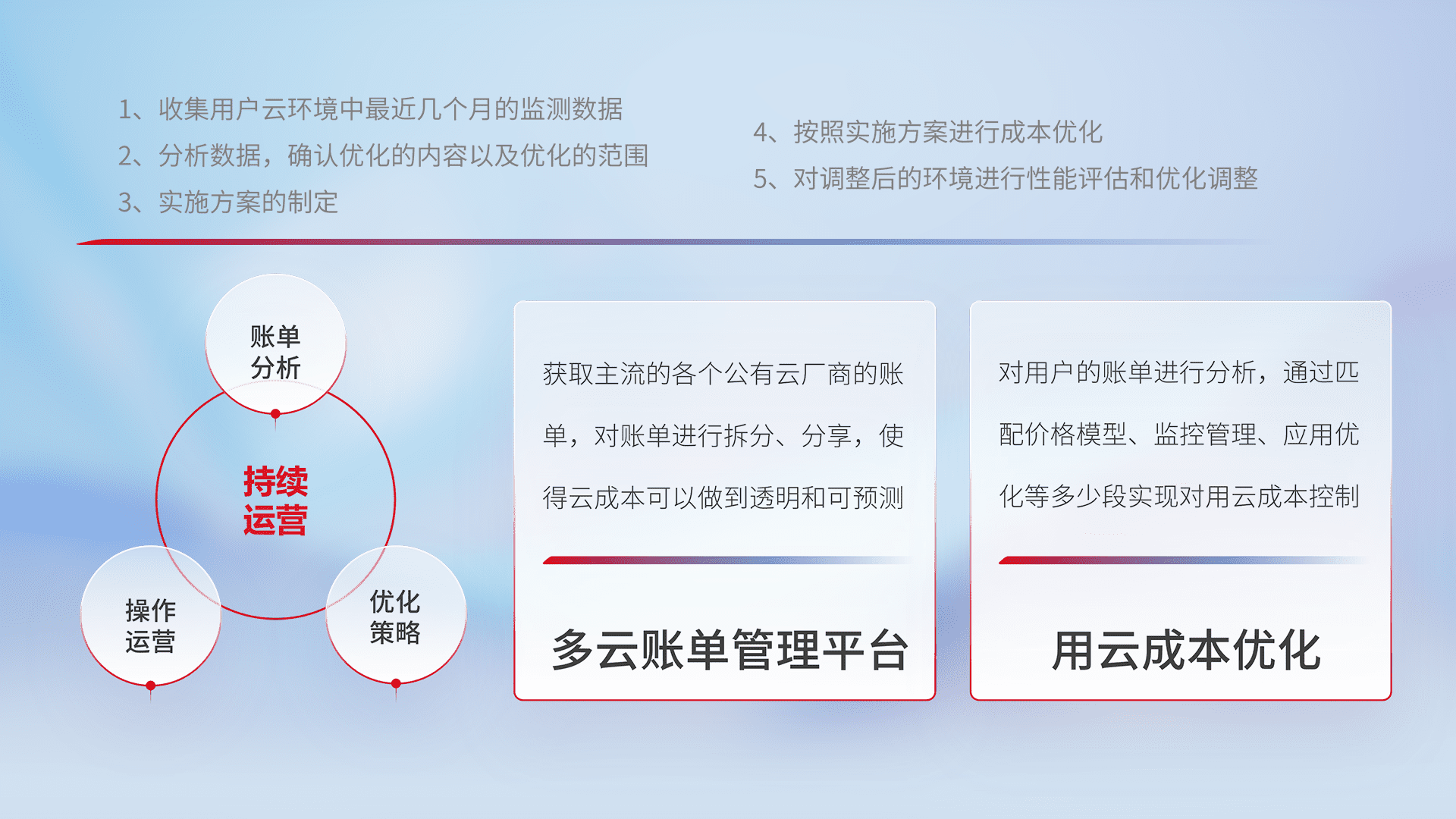 通过多云纳管,,,,以统一的资源数据模型把客户的云资源进行抽象和封装,,,进而实现对多云资源的统一操作,,,保障云资源管理的可靠性、、稳定性与可用性。。。量身定制化运维内容,,配置、、、开发运维、、补丁管理、、备份、、、监控、、、、认证和访问管理、、审计和日常巡检等,,,保障在用云过程中的可靠度,,,稳定度以及高可用率。。。。